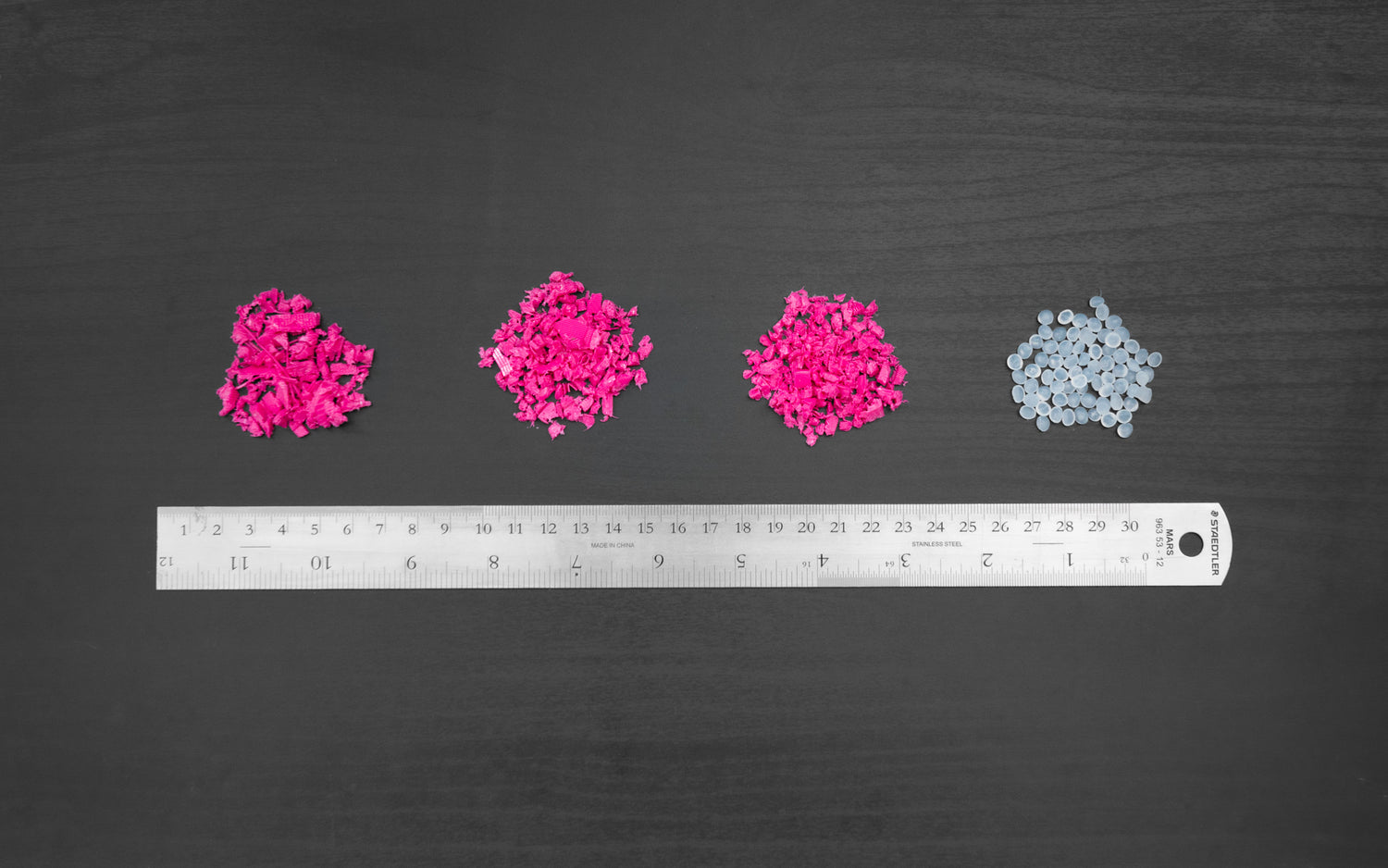 Still skeptical? Take a look at the photo on the left and compare the raw white plastic with 3 times shredded purple plastic material.